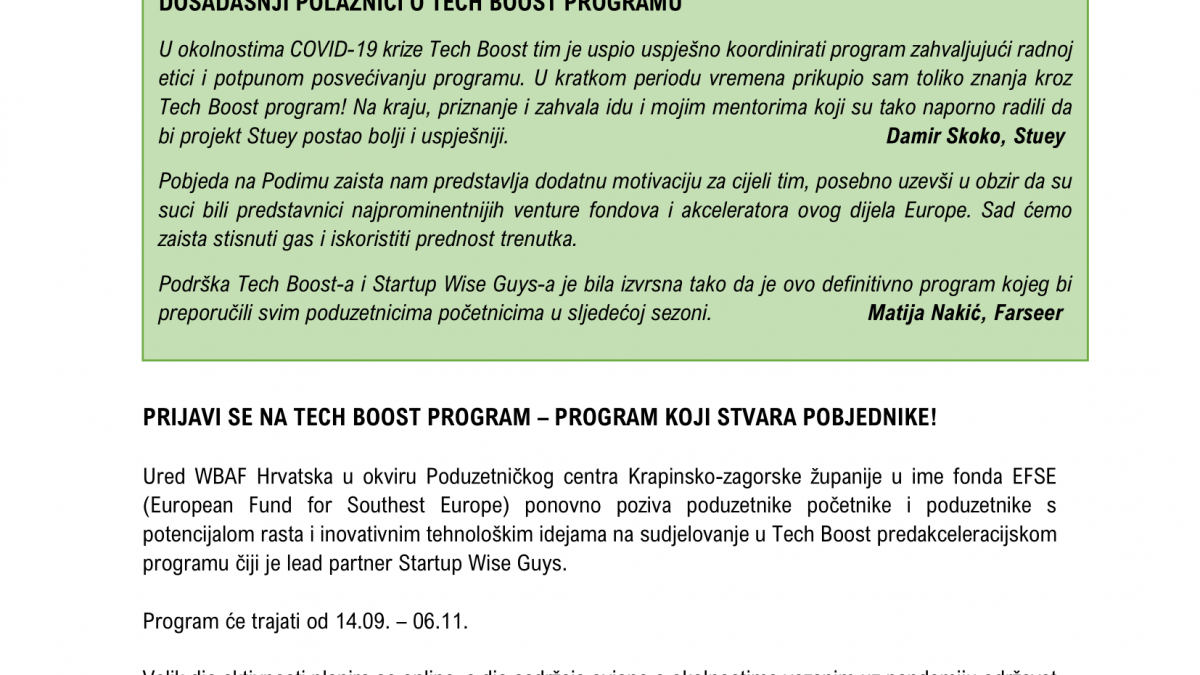 Informiraj se o Tech Boost programu i prijavi. Više o programu, preporuke prethodnih polaznika i poveznica za prijavu su popratnom dokumentu. Rok prijave: 06.09.
